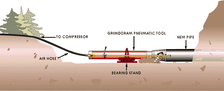 Pipe Ramming is an exceptionally quick method of installing large diameter pipelines up to distances of around 100m. A "direct line" route is taken and as the majority of the spoil gets contained within the pipeline(which is later cleaned out) settlement figures felt at the surface are the absolute minimum for any trenchless operation.